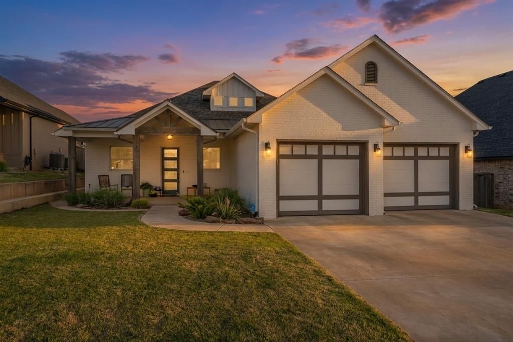 Experience water front living at its finest in this stunning 3-bedroom (plus office), 3-bathroom home located in Norman's prestigious Vintage Creek neighborhood, offering easy access to the University of Oklahoma and the bustling University North Park district. This magazine-quality property features a dedicated office and a bright, airy living room with vaulted ceilings, Roman electric shades, and a fireplace with custom built-ins. The chef's kitchen is a showstopper, boasting a massive island, high-end built-in appliances, and a full-size side-by-side refrigerator and freezer. Organization is effortless with a massive laundry room that doubles as a butler's pantry, complemented by an additional walk-in pantry nearby. This smart home is fully equipped with app-controlled lighting, a water softener, and a oversized garage featuring a built-in storm shelter and an electric vehicle charger. Outside, enjoy the new concrete walkway leading to a charming side garden, or relax on the covered patio overlooking a stocked community pond. Residents also enjoy resort-style amenities including a neighborhood pool and clubhouse, while the floored attic provides abundant extra storage space.